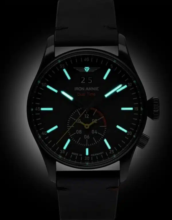 Ce garde-temps se présente doté d’un cadran noir, mis en valeur par des index en bâtons au style Militaire et entouré de chiffres arabes. Harmonie oblige, le logo « Iron Annie » vient ici se placer en lieu à 12 heures et est accompagné de l’inscription « Dual Time » couleur rouge.