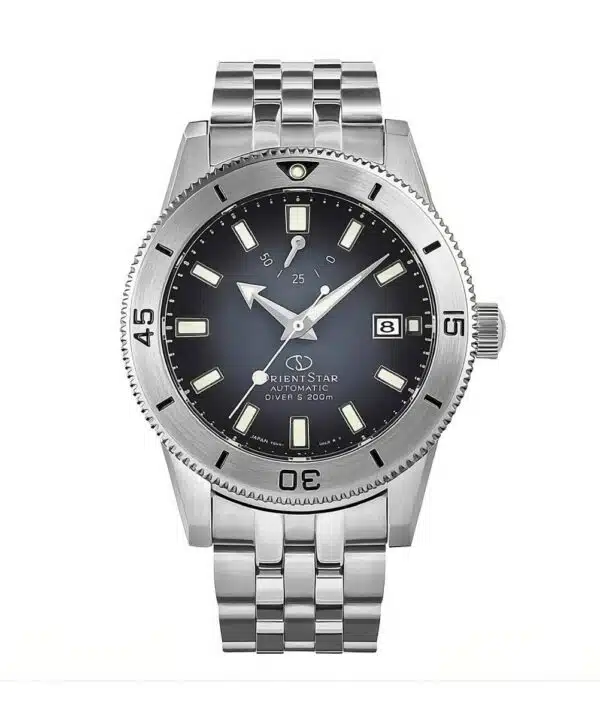 Conçue en acier inoxydable avec une finition mate brossée / satinée, elle présente un cadran bleu dégradé et des aiguilles et index luminescents pour une lisibilité optimale sous l’eau. La lunette rotative avec marqueurs luminescents permet de mesurer facilement le temps de plongée, tandis que le verre saphir traité antireflets protège le cadran contre les rayures et reflets. Le fond vissé assure sécurité et étanchéité.