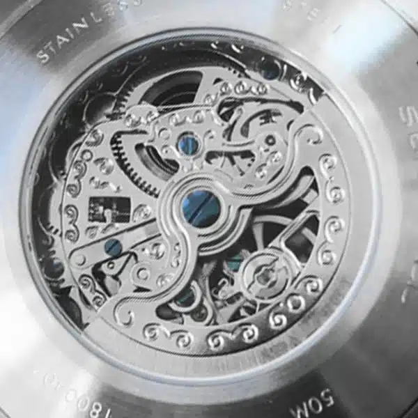 On retrouve un balancier doré, entouré de 21 pierres couleur rubis et saphir, emboité par de l’acier inoxydable résistant à 5 ATM, soit une étanchéité de 50 mètres.