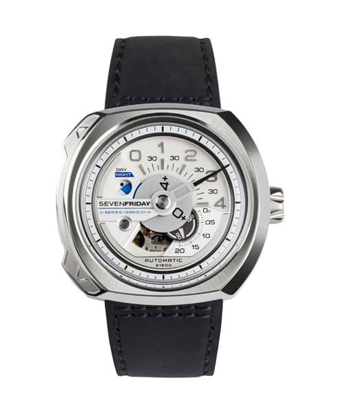 Le cadran de la V1/01 puise son inspiration dans cette roue industrielle. Il est fabriqué en acier inoxydable, et possède six niveaux de disques aux finitions argent, blanc mat, brossé et l’un des disques est même composé de rhodium, un composant chimique non radioactif.